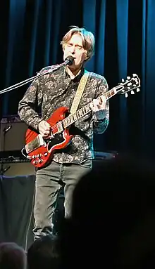 Johnson is best known for playing the lightly modified Fender Stratocasters and Gibson ES-335 electric guitars through either a Fender or Marshall amplifier, depending on whether he is targeting a clean rhythm, dirty rhythm, or lead tone.[39][40] He tends to swap out the bridge pickups in some of his Stratocasters for DiMarzio HS-2 pickups,[41] because they do not hum as much as standard single-coil pickups. Johnson has also played other guitar brands such as Robin, Rickenbacker, Jackson, Maton, and Charvel, one of which appears on the cover of the Ah Via Musicom album. In 2001, Johnson added a Gibson Custom Shop '59 Les Paul Reissue to his collection of guitars. Of note, he no longer uses a Dumble amplifier, as he had to replace a faulty component in his favorite Dumble, the Steel String Singer. It never sounded the same afterwards, and he sold the amplifier to Carlos Santana.