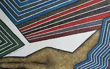 As the material on the canvas and the color process play an essential role, sand and metal filings are used to give a distinctive texture. The artist obviously has a dialectical approach towards "presence" and "absence" and towards the "painted" and "non-painted" matter in art, which seems to create a kind of tension, visually and mentally.[4]