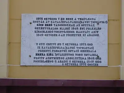 After the execution he was exhumed by his orderly who buried him under a pseudonym in the cemetery of Arad. Later he was re-buried at Katalinfalva (present-day Ravni Topolovac) where his body stayed for sixteen years. Afterwards his family moved his body to the family crypt, and since then his body has remained in the Catholic church in Elemér (present-day Elemir).