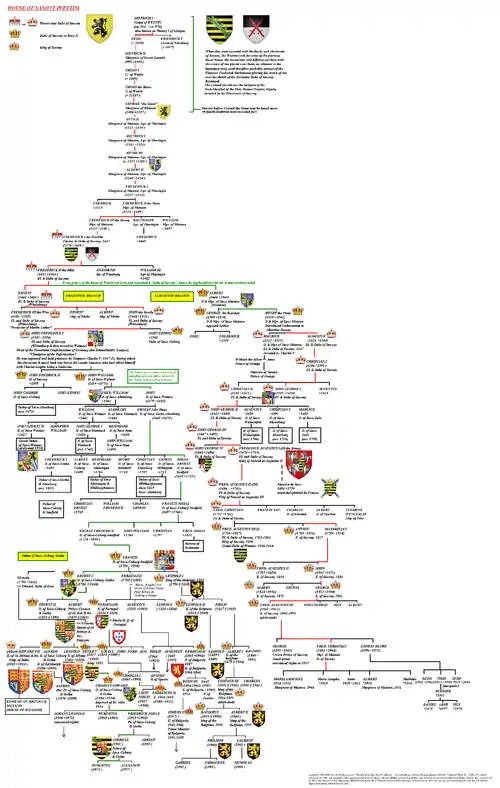- Saxe-Coburg-Gotha, last common descent from Francis, Duke of Saxe-Coburg-Saalfeld, further divided into: