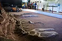 The Museum was inaugurated on 10 July 1997, and since 16 May 1999 it bears the name of Ernesto Bachmann,[3] who was an enthusiast of paleontology. The creation of the MEB was triggered by the finding of Giganotosaurus Carolinii,[4][5] one of the world's largest carnivorous dinosaurs, found in July 1993 by Rubén Darío Carolini[6]18 kilometres (11 mi) to the southwest of Villa El Chocón.