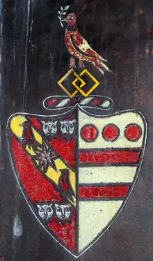 The identity of Sir Roger Mules "second son to the Lord Mules" and husband of the heiress of Ernsborough, is uncertain. The first certain ancestor of the 1st Baron Moels was his grandfather Nicholas de Moels (c. 1195 – 1264/72) of North Cadbury in Somerset, of unknown parentage,[16] a household knight and royal administrator of King Henry III,[17] who apart from having received a few royal grants of land in his own right, in 1230 married Hawise de Newmarch the wealthy co-heiress of the feudal barony of North Cadbury, which transformed him into a major landholder and feudal baron. In 1230 he was granted by King Henry III the Devonshire manors of King's Carswell and Diptford.[18] His second but eldest surviving son by Hawise was Roger de Moels (c.1233/7 – 1294) (father of the 1st Baron), who in 1268 received a grant of a weekly market and annual fair at his manor of King's Carswell[19] In 1293 he was appointed Keeper of the Forest of Braydon in Wiltshire.[20]