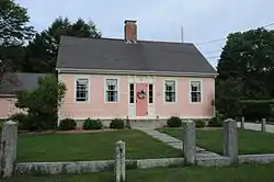 The Esbon Sanford House is an historic house at 88 Featherbed Lane in North Kingstown, Rhode Island. It is a 1+1⁄2-story wood-frame structure, five bays wide, with a central chimney and simple Federal-Greek Revival transitional styling. The main entry, centered on the front facade, is framed by small sidelight windows and pilasters, and is topped by an entablature. The most unusual feature of the house relates to its chimney: despite its central location, the interior of the house is organized in a central hall plan, with the flues of the flanking chambers rising at an angle and joining in the attic space to form the single chimney seen outside. The house was probably built in 1832 by Esbon Sanford, who established a textile mill nearby that same year.[2]