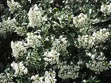 Escallonia 'Iveyi' is a hybrid cultivar planted as a garden ornamental. The cultivar originated as a natural hybrid seedling discovered in the garden of Caerhays Castle in Cornwall.[1] The cultivar was named for the Caerhays estate's gardener, David Ivey, by Edgar Thurston in his book British & foreign trees and shrubs in Cornwall.[2] Thurston believed it to be a hybrid of E. montevidensis and E. × exonensis (E. rosea × E. rubra).,[2] whereas others later adjudged the female parent to be E. bifida. The shrub was accorded the Royal Horticultural Society's Award of Merit in 1926,[3] and the Award of Garden Merit in 1993.[4]