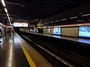 Escuela Militar is an underground metro station on the Line 1 of the Santiago Metro, in Santiago, Chile. It is located beneath the cloverleaf-like interchange of Apoquindo Avenue and Américo Vespucio Avenue. The station was opened on 22 August 1980 as part of the extension of the line from Salvador to Escuela Militar. It remained the eastern terminus of the Line 1 until 7 January 2010, when the line was extended to Los Dominicos,[2] and is named for the nearby Escuela Militar del Libertador Bernardo O'Higgins.