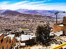 Stadium seen from El Alto, with Teleférico La Paz–El Alto between