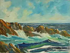 She is particularly known for her seascapes of the California coast of an Impressionistic style,[3] and she also made still life and landscape paintings. She painted with oils and watercolor. Aside from easel painting, Rose explored silk-screening, serigraphy, screenprinting, printmaking and collages.[11][12]