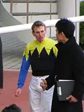 ![]() Racing colours of Queen Elizabeth II, as used by her father King George VI and great-grandfather King Edward VII: Purple, gold braid, scarlet sleeves, black velvet cap, gold fringe[1] | |