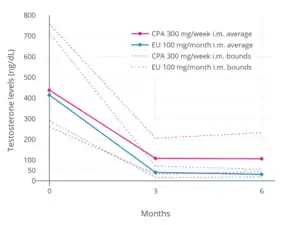 An expanded report of 191 patients, which included the 42 patients from the University of Mainz center plus an additional 149 patients from 11 other centers, was published in 1982.[43][49] The antitumor effectiveness of estradiol undecylate and cyproterone acetate in this study was equivalent.[43][45][58][46][28][47] The rates of improvement, no response, and deterioration were 52%, 41%, and 7% in the estradiol undecylate group and 48%, 44%, and 8% in the cyproterone acetate group, respectively.[43][46] However, the incidence of a selection of specific side effects, including gynecomastia, breast tenderness, and edema, was significantly lower in the cyproterone acetate group than in the estradiol undecylate group (37% vs. 94%, respectively).[43][45][46][59] Gynecomastia specifically occurred in 13% (12/96) of the patients in the cyproterone acetate group and 77% (73/95) of the patients in the estradiol undecylate group.[43][45] Erectile dysfunction occurred in "essentially all" patients in both groups.[49] Leg edema occurred in 18% (17/95) of the estradiol undecylate group and 4.2% (4/96) of the cyproterone acetate group, while the incidences of superficial thrombophlebitis and coronary heart disease both were not described.[43] The incidence of thrombosis was 4.2% (4/95) in the estradiol undecylate group and 5.3% (5/96) in the cyproterone acetate group.[43][48][49] There were five deaths in total, three in the estradiol undecylate group and two in the cyproterone acetate group.[43] Two of the deaths in each of the treatment groups were due to cardiovascular events, while the remaining death in the estradiol undecylate group was due to unknown causes.[43][46][49] The similar rate of cardiovascular complications besides edema between estradiol undecylate and cyproterone acetate that was observed is in contrast to the initial 42-patient report and to findings with other estrogens, such as diethylstilbestrol and estramustine phosphate, which have been shown to possess significantly higher cardiovascular toxicity than cyproterone acetate.[45] On the basis of the expanded study, the researchers concluded that cyproterone acetate was an "acceptable alternative" to estrogen therapy with estradiol undecylate, but with a "considerably more favorable" side-effect profile.[46]