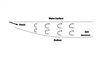 Inverse estuaries occur in dry climates where evaporation greatly exceeds the inflow of freshwater. A salinity maximum zone is formed, and both riverine and oceanic water flow close to the surface towards this zone.[7] This water is pushed downward and spreads along the bottom in both the seaward and landward direction. The maximum salinity can reach extremely high values and the residence time can be several months. In these systems, the salinity maximum zone acts like a plug, inhibiting the mixing of estuarine and oceanic waters so that freshwater does not reach the ocean. The high salinity water sinks seaward and exits the estuary.[8][9]