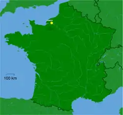 It is not known if the village gave its name to the first castle, or the opposite. It was called Esteilant in 1050–1066, from the Old English land[1] and maybe Old English stēġili that means "steep" or "sheer".[2] Many farmers from the Danelaw had settled in Normandy with the Danes in the 10th century,[3] which explains why there are typical Old English place name elements in the Norman toponymy, for example: croft > crot > croc(q): Vannecrocq (Wanescrotum 11th century) = Walshcroft, Lincolnshire or stān > esta(i)n, éta(i)n: Fatouville-Grestain (Grestano 11th century) = Garston, Hertfordshire (Grestan 11th century) 'great stone', etc.[4]