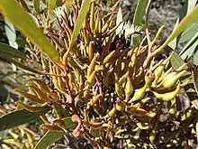 Eucalyptus clivicola is a mallet that typically grows to a height of 12 m (39 ft) and rarely forms a lignotuber. It has smooth grey over yellowish bark with flakes of rough, greyish bark that has not been completely shed. Its adult leaves are linear to lance-shaped, 45–95 mm (1.8–3.7 in) long and 5–20 mm (0.20–0.79 in) wide on a petiole 5–15 mm (0.20–0.59 in) long. The flower buds are arranged in groups of between nine and thirteen on a peduncle 7–20 mm (0.28–0.79 in) long that widens near the end, the individual buds on a pedicel 4–5 mm (0.16–0.20 in) long. Mature buds are top-shaped to elongated, 14–21 mm (0.55–0.83 in) long and 3–4 mm (0.12–0.16 in) wide with a conical to horn-shaped operculum up to three times as long as the floral cup. Flowering occurs from December to May and the flowers are pale yellow. The fruit is a woody, barrel-shaped, to conical or cylindrical capsule 6–10 mm (0.24–0.39 in) long and 5–6 mm (0.20–0.24 in) wide.[3][4][5]