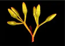 Eucalyptus cylindriflora is a mallee that typically grows to a height of 1.5–6 m (4 ft 11 in – 19 ft 8 in) and forms a lignotuber. It has smooth white to greyish bark. Young plants and coppice regrowth have linear to lance-shaped leaves that are glossy green on the upper surface, dull below, 40–80 mm (1.6–3.1 in) long and 5–15 mm (0.20–0.59 in) wide. The adult leaves are linear, the same glossy green on both sides, 40–75 mm (1.6–3.0 in) long and 4–10 mm (0.16–0.39 in) wide on a petiole 3–13 mm (0.12–0.51 in) long. The flower buds are arranged in groups of seven on a thin peduncle 9–27 mm (0.35–1.06 in) long, the individual buds on a pedicel 4–10 mm (0.16–0.39 in) long. Mature buds are oval to cylindrical, 10–13 mm (0.39–0.51 in) long and 4–7 mm (0.16–0.28 in) wide with a conical operculum. Flowering occurs from December to March and the flowers are creamy white. The fruit is a woody cylindrical to cup-shaped capsule 6–10 mm (0.24–0.39 in) long and 6–9 mm (0.24–0.35 in) wide.[2][4][5]