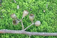 Eucalyptus regnans is similar to E. fastigata but has rough bark only at the base of the trunk, smaller buds and fruit, and a wider distribution in Victoria.[4]