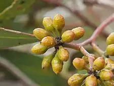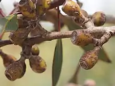 Eucalyptus leptocalyx is a mallee that typically grows to a height of 2 to 8 metres (7 to 26 ft) and forms a lignotuber. It has smooth brownish over light pink bark. Young plants and coppice regrowth have leaves that are arranged alternately, egg-shaped, 50–85 mm (2.0–3.3 in) long, 30–45 mm (1.2–1.8 in) wide and have a petiole. Adult leaves are the same slightly glossy green on both sides, lance-shaped, 75–120 mm (3.0–4.7 in) long and 10–28 mm (0.39–1.10 in) wide on a petiole 12–35 mm (0.47–1.38 in) long. The flower buds are arranged in leaf axils in groups of between nine and fifteen on an unbranched peduncle 5–15 mm (0.20–0.59 in) long, the individual buds on pedicels 1–6 mm (0.039–0.236 in) long. Mature buds are cylindrical, 8–13 mm (0.31–0.51 in) long, 4–6 mm (0.16–0.24 in) wide with a conical operculum 2–5 mm (0.079–0.197 in) long. Flowering occurs from September to March and the flowers are creamy white. The fruit is a woody, barrel-shaped to cylindrical capsule 7–12 mm (0.28–0.47 in) long and 6–8 mm (0.24–0.31 in) wide with the valves enclosed below the rim.[2][3][4][5]