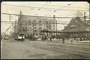 The final stationhouse opened for service on June 8, 1902, with the previous structure being demolished shortly afterwards to make room for parking on the west side of the station.[14] The tracks over Euclid Avenue were elevated in the early 1910s, prompting a repurposing of this station. On June 13, 1913, the station was temporarily closed "and then moved about twenty-five feet west and thirty feet south", allowing for the expansion of the station underneath the tracks, the vault of which is still extant today.[15] The expanded station opened on March 3, 1914, implementing the 1902 at-grade stationhouse into the design.[16] Permanent platforms and platform shelters were added once the elevated structure could settle.
