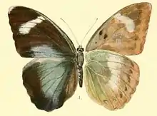 E. inanum Btlr. (42 d; 44 c). Both wings beneath without black discal and submarginal spots, but with 2 or 3 black dots in the cell of the forewing and 1 or 2 in that of the hindwing; hindwing beneath in both sexes with sharply defined white median band, sometimes broken up into spots, extending from the costal margin to vein 3 or 4; hindwing often with bluish or green submarginal spots on both surfaces; subapical band of the forewing above light yellowish (male) or nearly white (female), beneath white; the bluish hindmarginal spot on the upperside of the forewing narrow. Sierra Leone to Angola. [3]