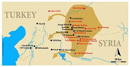 EU_HSHR figurines are attested only west of the Euphrates and, in particular, the Euphrates valley seems to be the main centre of production. From this area several specimens have been collected at Carchemish, Tell Ahmar, Tell Amarna, Deve Höyük, Tell Shiukh Fawqani, Saraga Höyük, and Zeytinli Bahçe Höyük. The figurines are linked only to sites with a strong Neo-Assyrian presence as a result of prolonged control. The figurines do not appear at other nearby sites where the Neo-Assyrian invasion caused socio-economic impoverishment, such as Tell Sheikh Hassan, Tell Qara Quzaq, Tell Qara Quyu Tahtani, and Tell Khamis. Outside the Euphrates’ catchment area, there are sporadic finds to the west at sites like Zincirli Höyük, Tell Judaidah, Chatal Höyük, Tell Tayinat, Tell Abu Danne, and likely in Tell Rifaat and Neirab.[7]
