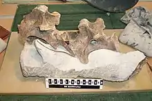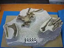 After more fossil material was found, including bones, excavation of the bone-bearing layer commenced in April 1999, conducted by a local association of private fossil collectors. Although the quarry operator was cooperative, excavation was complicated by the near-vertical orientation of the layers that limited access, as well as by the ongoing quarrying. The sauropod material could not be excavated directly from the layer but had to be collected from lose blocks that resulting from blasting. The exact origin of the bone material was therefore unclear, but could later be traced to a single bed (bed 83).[3][4] An excavation conducted between July 20–28 of 2000 rescued ca. 50 t (49 long tons; 55 short tons) of bone-bearing blocks containing vertebrate remains.[5] Fossils were prepared and stored in the Dinosaur Park Münchehagen (DFMMh), a private dinosaur open-air museum located close to Hanover. Due to the very good preservation of the bones, consolidating agents had to be applied only occasionally, and preparation could be conducted comparatively quickly as bone would separate easily from the surrounding rock. Bones of simple shape could sometimes be prepared in less than an hour, while the preparation of a sacrum required a workload of three weeks. By January 2001, 200 single vertebrate bones had already been prepared. At this point, the highest bone density was found in a block measuring 70 x 70 cm, which contained ca. 20 bones.[4] By January 2002, preparation of an even larger block had revealed a partial sauropod skull – the first to be discovered in Europe. Before complete removal of the bones from the block, a silicon cast was made of the block to document the precise three-dimensional position of the individual bones.[5]