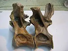 A series of all complete sacral vertebrae is only known from a single specimen, DFMMh/FV 100, which was destroyed in a fire in 2003. All five vertebrae, the characteristic number of more basal neosauropods, are incorporated into the sacrum. The third and fourth sacrals represent the primordial sacrals, present in all dinosaur groups. The second, S2, is the ancestral sauropodomorph sacral that was added in basal sauropodomorphs, who all share three sacrals to the exception of Plateosaurus. The fifth sacral, fused behind the primordial pair, is a caudosacral, migrated from the tail into the pelvis in taxa around Leonerasaurus. The first sacral, articulated with the ilium but not fused to the other vertebrae, represents the dorsosacral, bringing the count to five vertebrae found in all neosauropods. The level of fusion of the dorsosacral confirms the evolutionary history of the sauropod sacral count: the primordial pair incorporating first a dorsal (total of three), then a caudal (total of four), then another dorsal to make a total of five vertebrae.[7]