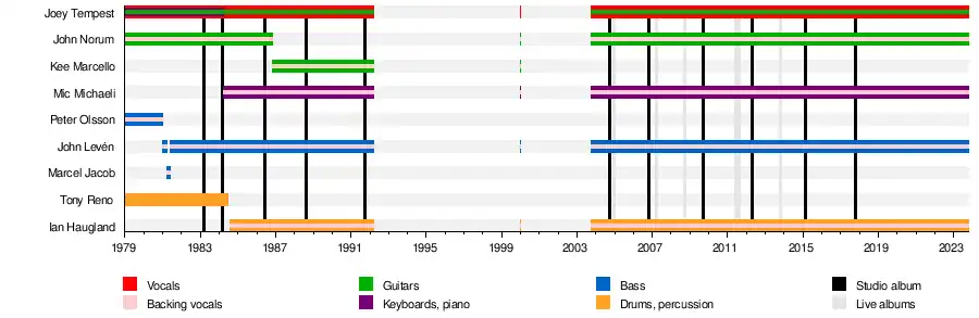 The first incarnation of the band was named Force and came together in 1979, in Upplands Väsby, Stockholm, and was integrated by vocalist Joey Tempest, guitarist John Norum, bass guitarist Peter Olsson, and drummer Tony Reno.[11] "I remember when we started the band Force we were playing covers in the rehearsal room, because we just wanted to learn our instruments, like all bands," Tempest said, "Then one day I said maybe we should do our own stuff. Nobody had any ideas, so I brought mine into the rehearsal room, and that is when we started writing our own stuff."[12]