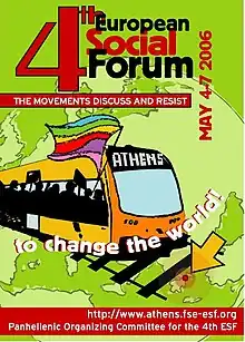 The fourth European Social Forum was held in Athens,[5] Greece on 4–7 May 2006. According to the organizers, more than 35,000 registered. The demonstration on 7 May, Saturday afternoon, was announced by the media to have a participation of 80,000 demonstrators, a record in Athens since the anti-war mobilisation on February 15, 2003.