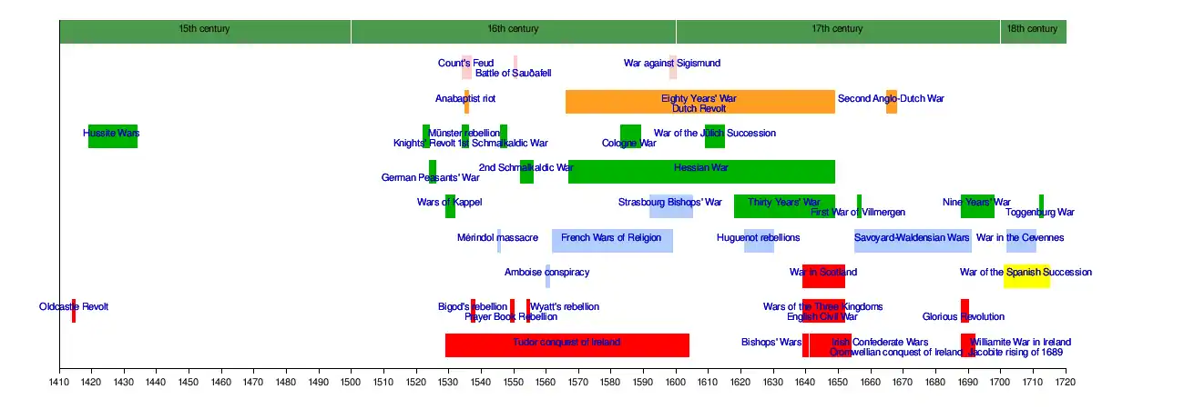 Jacobite rising of 1689Williamite War in IrelandCromwellian conquest of IrelandIrish Confederate WarsBishops' WarsTudor conquest of IrelandGlorious RevolutionEnglish Civil WarWars of the Three KingdomsWyatt's rebellionPrayer Book RebellionBigod's rebellionOldcastle RevoltWar of the Spanish SuccessionScotland in the Wars of the Three KingdomsAmboise conspiracyCamisardSavoyard-Waldensian WarsHuguenot rebellionsFrench Wars of ReligionMérindol massacreToggenburg WarNine Years' WarFirst War of VillmergenThirty Years' WarStrasbourg Bishops' WarWars of KappelHessian WarSecond Schmalkaldic WarGerman Peasants' WarWar of the Jülich SuccessionCologne WarSchmalkaldic WarMünster rebellionKnights' RevoltHussite WarsSecond Anglo-Dutch WarDutch RevoltEighty Years' WarAnabaptist riotWar against SigismundBattle of SauðafellCount's Feud