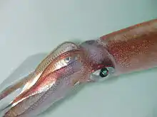 The European squid has a long, moderately slender and cylindrical body. Rhomboid fins comprise two-thirds of the mantle length, though locomotion is via jet propulsion.[3] The posterior border is slightly concave. The head is relatively small and has large eyes which are covered with a transparent membrane. Like almost all squid, this species has ten limbs surrounding the mouth and beak: eight are relatively short arms, and two, which form the tentacles, are long, as they are used to catch prey. The fourth left arm of males is a hectocotylus. The European squid can grow up to 30–40 cm in the mantle length, but more usually they are 15–25 cm long. The males are generally bigger than the females and exhibit more rapid rates of growth.