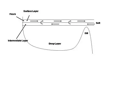 Stratified waters, in combination with slow vertical mixing, are essential to maintaining euxinic conditions.[1] Stratification occurs when two or more water masses with different densities occupy the same basin. While the less dense surface water can exchange gas with the oxygen-rich atmosphere, the denser bottom waters maintain low oxygen content. In the modern oceans, thermohaline circulation and upwelling prevent the oceans from maintaining anoxic bottom waters. In a silled basin, the stable stratified layers only allow surface water to flow out of the basin while the deep water remains anoxic and relatively unmixed. During an intrusion of dense saltwater however, the nutrient-rich bottom water upwells, causing increased productivity in the surface, further enhancing the nutrient trap due to biological pumping. Rising sea level can exacerbate this process by increasing the amount of deep water entering a silled basin and enhancing estuarine circulation.[15][16]