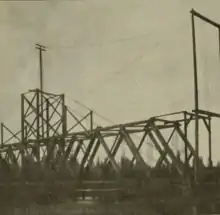 Two draw bridges were crossed by this railroad, necessitating a pivot pole in the center of the draw span carrying the trolley, feeder, and return current cables up over this pole high enough to allow the passage of vessels up the river. Taps are made off of these cables at the pivot pole to the trolley and track on the bridge.