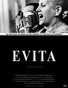 Evita is a documentary about Eva Duarte. The film was written and directed by Eduardo Montes-Bradley.[1][2] Conformed in its entirety with previously unseen historical footage and documents, the documentary reconstructs the life of former Argentine first lady from an neutral perspective.