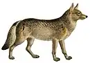 Canis priscolatrans lived in the late Pliocene-Early Pleistocene in North America.[23] The first definite wolf appeared in the Late Blancan/Early Irvingtonian,[22]: p240 [23][37] and named C. priscolatrans that was either very close to[33][34] or a synonym for Canis edwardii.[22]: p241 [23]: 82 [38][39] It resembled C. rufus in cranial size and proportions but with more complex dentition.[22]: p241 However, there are no fossils of C. rufus until the Late Rancholabrean.[22]: p242