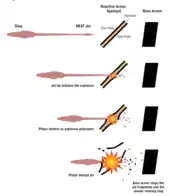 The disruption is attributed to two mechanisms. First, the moving plates change the effective velocity and angle of impact of the shaped charge jet, reducing the angle of incidence and increasing the effective jet velocity versus the plate element. Second, since the plates are angled compared to the usual impact direction of shaped charge warheads, as the plates move outwards the impact point on the plate moves over time, requiring the jet to cut through fresh plates of material. This second effect significantly increases the effective plate thickness during the impact.