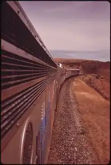 ![]() The Expo '74 rounds a curve near Wenatchee, Washington, on the ex-Great Northern route. Note the dome coach. | |