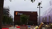 The overall budget for the Canadian pavilion was 45 million Canadian dollars (US$43.57 million).[30] Cirque du Soleil designed the concept for the pavilion[29] and also created public performances, organized cultural programs[29] and developed strategic corporate alliances for the pavilion. The exterior of the pavilion was covered in polished steel and cedar.[29] The pavilion was anchored by an open public square and surrounded by three large, wooden, curved structures.[28] The square was a performing area, with performances by Cirque du Soleil.[28] Part of the pavilion's exterior walls were covered by a special kind of greenery and rainwater was collected by a drainage system for use inside the pavilion.