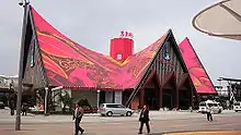 The chief architect of the pavilion was He Jingtang, the director of the Architectural Academy of the South China University of Technology.[33] The 63-meter high pavilion, the tallest structure at the Expo, is dubbed "The Oriental Crown" because of its resemblance to an ancient Chinese crown.[18] The architectonic feature of the building was inspired by traditional Chinese roof brackets known as dougong which date back nearly 2,000 years. The exterior is painted in various shades of Chinese red, symbolising Chinese culture and good fortune.