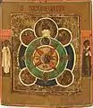 The next circle is green or red, it can represent the sky, sometimes starry. In the outermost circle usually depicted seraphim, or angels with scrolls. Above it on the central axis is a truncated circle, in which the heaven is depicted, God the Father with a gesture of blessing is seen in this circle. From God the Father emanates the Holy Spirit, descending in the form of a dove on the head of the Theotokos.[1][3]