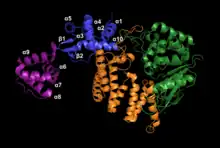 The SAP region contains three major components: α9, α5β1, and α7. The core helix α9 stabilizes the protein as it moves through dimer configurations and mediates the interactions between α5β1 and α7 as they adjust their positions. These three configurations are the substrate scanning, substrate latching and substrate unwinding forms (figure 2).[6]