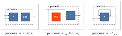 Contrary to Max-like visual programming languages where the user does manual connections, FAUST primitives are assembled in block diagrams by using a set of high-level block diagram composition operations.