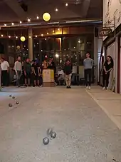 Pétanque (French pronunciation: [petɑ̃k] , locally in Provence [peˈtãᵑkə]; Occitan: petanca, [peˈtaŋkɔ] , also Catalan: [pəˈtaŋkə] or [peˈtaŋka]) is a sport that falls into the category of boules sports (along with raffa, bocce, boule lyonnaise, lawn bowls, crown green bowling). In these sports, players or teams play their boules/balls towards a target ball.[1] In pétanque the objective is to score points by having boules closer to the target than the opponent after all boules have been thrown. This is achieved by throwing or rolling boules closer to the small target ball, officially called a jack[2] (French: cochonnet),[3] or by hitting the opponents' boules away from the target, while standing inside a circle with both feet on the ground. The game is normally and best played on hard dirt or gravel. It can be played in public areas in parks or in dedicated facilities called boulodromes.