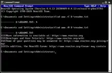 The command is available in DOS,[4] Digital Research FlexOS,[5] IBM/Toshiba 4690 OS,[6] IBM OS/2,[7] Microsoft Windows,[8] and ReactOS.[9] On MS-DOS, the command is available in versions 2 and later.[10] DR DOS 6.0[11] and Datalight ROM-DOS[12] include an implementation of the find command. The FreeDOS version was developed by Jim Hall and is licensed under the GPL.[13]
