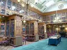 In 1682, Robert Sibbald donated around one hundred books to the college.[17] At the end of the 18th century the library was located at the Royal Infirmary.[4]: 50 The college's library in Queen Street bears Sibbald's name in commemoration.[17][18] The library also has artefacts, such as a medicine chest that belonged to Stuart Threipland, physician to Bonnie Prince Charlie.[19] In the 1960s, the information held by the library was modern.[20] From the sixties onward, medical information became more available and college's library became more known for its historical works.[17]