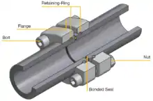 The special inside contour of the retaining ring flange covers the retaining ring, which is installed onto the machined pipe end. A form-closed connection results from the tightening of the flange, which will be sealed by bonded seal or pipe seal carrier on the face side.