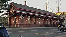 Old station buildings, now reused for other purposes, are adjacent to both platforms. The brick eastbound (south) station was built in 1882. It replaced a station burned by a fire, and "is typical of the substantial brick stations built at small-town stops throughout the state in the period. Whereas earlier stations had been small wood-frame buildings, often in a picturesque Gothic or Italianate style, the stations of the 1880s were brick" to be fire-resistant and were larger to accommodate larger waiting areas and other amenities. They were "well-built but utilitarian" structures.[5]: 5 The wooden westbound station "stands as an excellent example of the New Haven Railroad's 1890s passenger facilities" reflecting changed priorities.[5]: 5