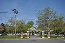 Fairview Cemetery is located in a residential area north of Dalton's Main Street, and consists of about 6.3 acres (2.5 ha), bounded by Warren Avenue on the west, Washington Street on the north, and Curtis Avenue on the east, with residences lining John Street to the south. It has the same number of plots as the larger (10-acre) Main Street Cemetery. The street side of the cemetery, facing Curtis Street, is lined with wrought iron fencing, and features a main gate with granite gateposts. The remaining sides of the cemetery are closed off from the surrounding neighborhood by chain link fencing. The grounds of the cemetery were designed in the fashionable rural cemetery style, with winding paths and mature plantings, although the density of plots is somewhat higher than typical. Most of the grave markers are modest in scope and scale. The cemetery continues in active use.[2]