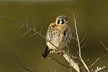 American kestrels feed largely on small animals such as grasshoppers,[34] crickets, butterflies, moths,[35] dragonflies, beetles,[36] lizards, mice, voles, shrews, frogs,[35] and small birds. The kestrel has also been reported to have killed scorpions, snakes,[37] bats,[38] and squirrels.[39] The kestrel is able to maintain high population densities, at least in part because of the broad scope of its diet. The American kestrel's primary mode of hunting is by perching and waiting for prey to come near. The bird is characteristically seen along roadsides or fields perched on objects such as trees, overhead power lines, or fence posts. It also hunts by kiting, hovering in the air with rapid wing beats and scanning the ground for prey. Other hunting techniques include low flight over fields, or chasing insects and birds in the air.[40]