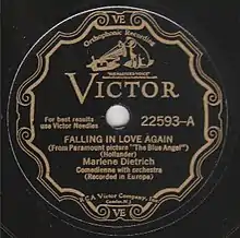 "Falling in Love Again (Can't Help It)" is the English language name for a 1930 German song composed by Friedrich Hollaender as "Ich bin von Kopf bis Fuß auf Liebe eingestellt" (literally: "I am, from head to toe, ready for love"). The song was originally performed, in the 1930 film Der Blaue Engel (English translation: The Blue Angel), by Marlene Dietrich, who also recorded the most famous English version, which became her anthem. Dietrich is backed by the Friedrich Hollaender Orchestra.