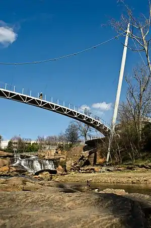The park's most striking feature is a unique pedestrian bridge that curves around a waterfall on the Reedy River. Named the Liberty Bridge at Falls Park on the Reedy, the 355-foot (108 m) long suspension bridge is supported by cables on only one side, giving an unobstructed view of the falls. It was designed by Boston firm Rosales + Partners with German firm Schlaich Bergermann & Partner as structural engineers and completed in the fall of 2004. It was awarded the Arthur G. Hayden medal for innovative design in 2005.[2]