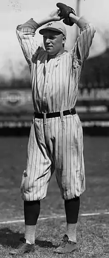 CCBL Hall of Famer Danny "Deacon" MacFayden, a Cape Cod native from Truro, played for Falmouth in 1925. The season was highlighted by MacFayden's one-hitter against Hyannis.[44] By 1926, he was playing for the hometown Boston Red Sox and went on to pitch for 17 years in the major leagues, winning a World Series title with the New York Yankees in 1932. Haskell "Josh" Billings played for Falmouth from 1925 to 1927, was team MVP in 1925, and finished the 1927 season playing for the Detroit Tigers.[45][46][34] National Football League running back Curly Oden spent his off-season as Falmouth's player-manager in 1927 and 1928. Oden was known as "the king of the base stealers in the league," having "thrilled the crowds on several occasions by stealing home."[47][48][49] CCBL all-league catcher Gene Connell played for Falmouth from 1927 to 1929, and went on to play for the Philadelphia Phillies.[50][51][52] Future major league umpire Bill Stewart pitched for Falmouth in 1929.[53][54] Prior to joining Falmouth in 1929, shortstop Waddy MacPhee had played briefly for the New York Giants.[55][56][57]