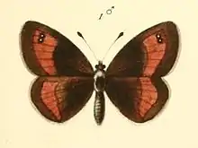 The wingspan is 18–20 mm. The ground colour is dark brown butterfly. There is an orange postdiscal band adorned with two ocelli with white pupils on the forewing. These are more or less marked according to the individuals. Adults are on wing from July to August.